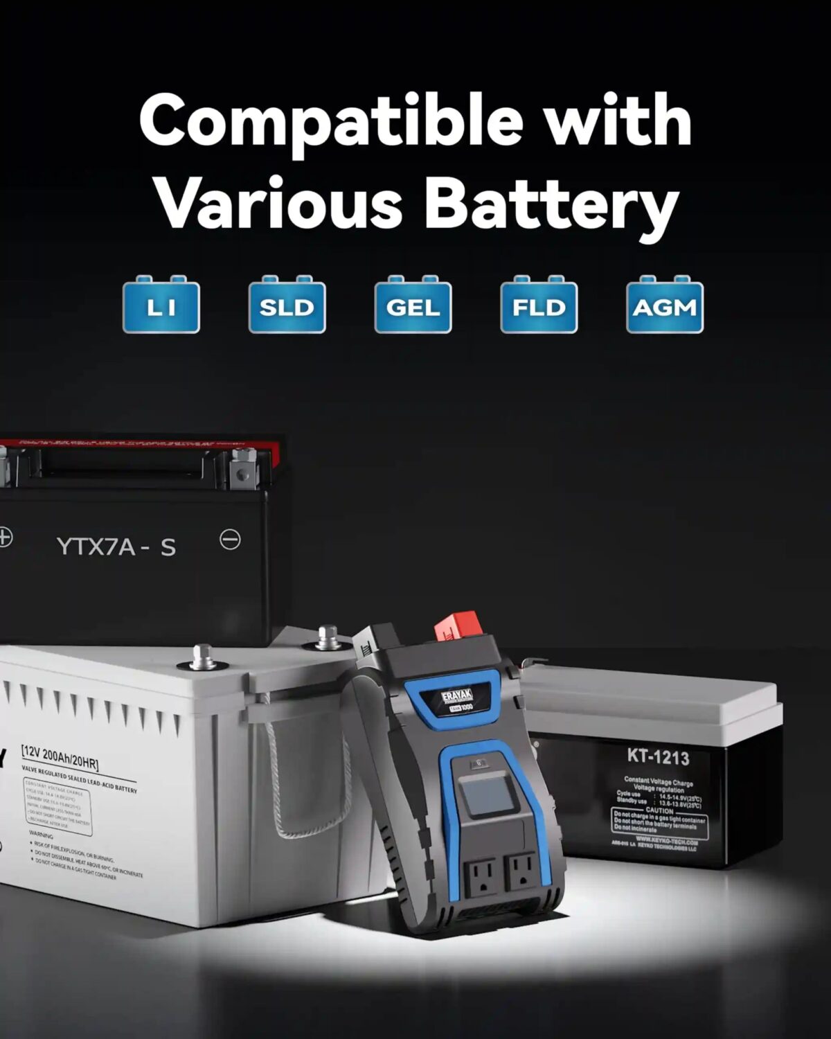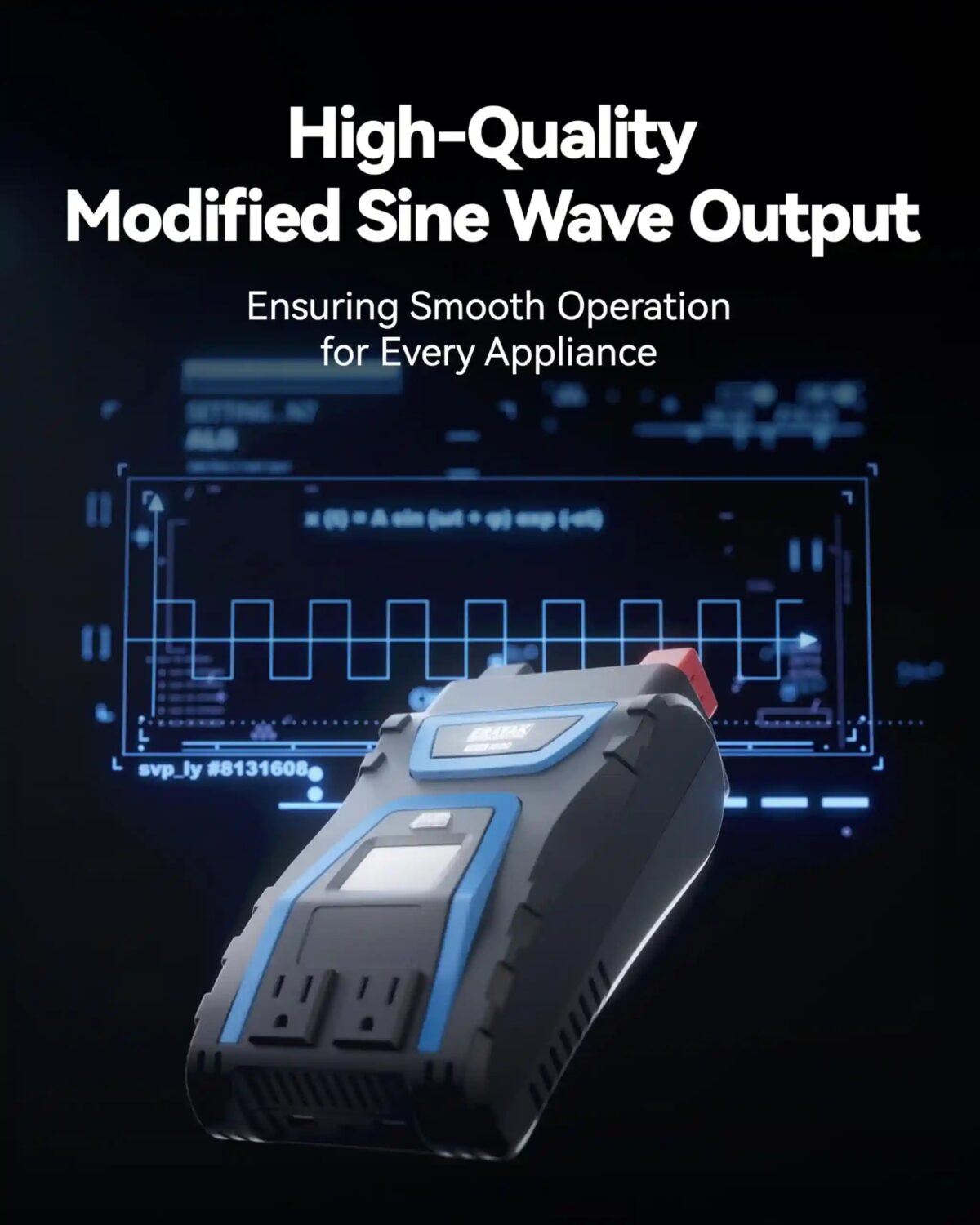 Advanced Safety & Auto Reset– Protection includes automatic shutoff for low voltage (9.5V) and high voltage (15.5V). The inverter resumes automatically when safe conditions return, or can be manually reset via the power button, ensuring continuous and safe performance even under heavy use.