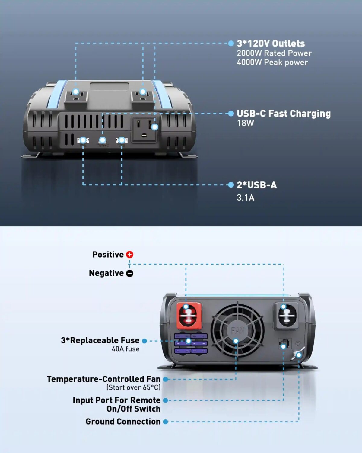 The Newly Upgraded Mid-Power Inverter – The Erayak TANK2000 delivers 2000W continuous and 4000W surge power, converting 12V DC to 115V AC. Built with high-frequency conversion technology and pure copper terminal cables, it ensures efficient, stable performance. Equipped with 2×110V AC outlets, 1×USB-A, and 1×USB-C (3.1A shared), it’s perfect for phones, laptops, tablets, fans, and power tools.