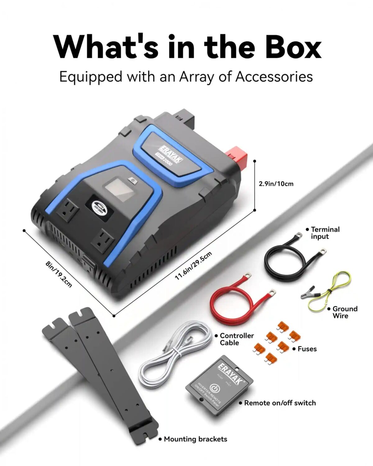What You’ll Receive & Trusted Support – Package includes 1×2000W inverter, 1 pair of terminal cables, 1×3m remote switch, and a user manual. Backed by Erayak’s responsive U.S.-based customer service, with phone and email support available whenever you need it.
