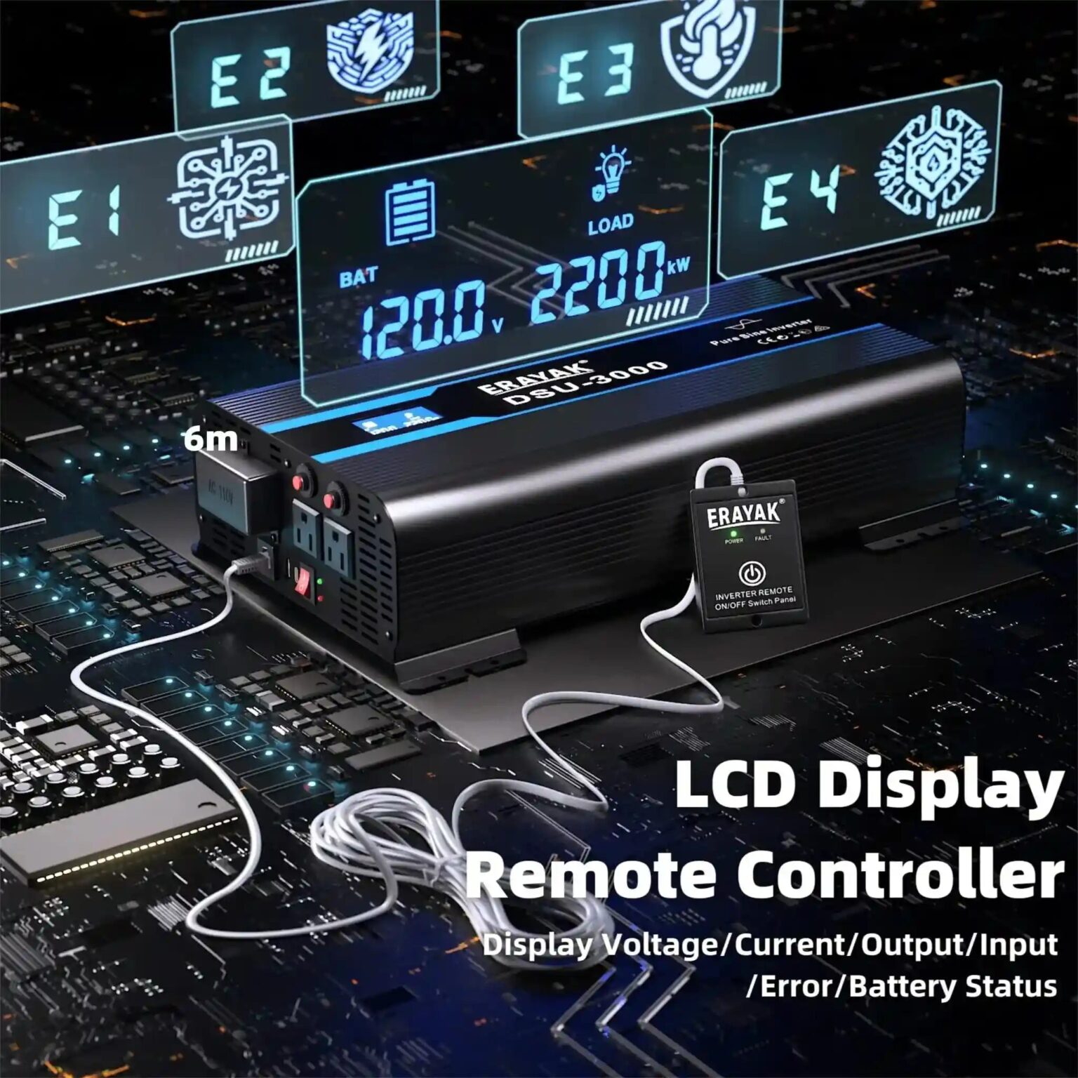 Stay informed with the built-in LCD screen that displays input/output voltage, power usage, and error messages. A 6-meter remote control is included, allowing convenient operation from inside your vehicle or home.