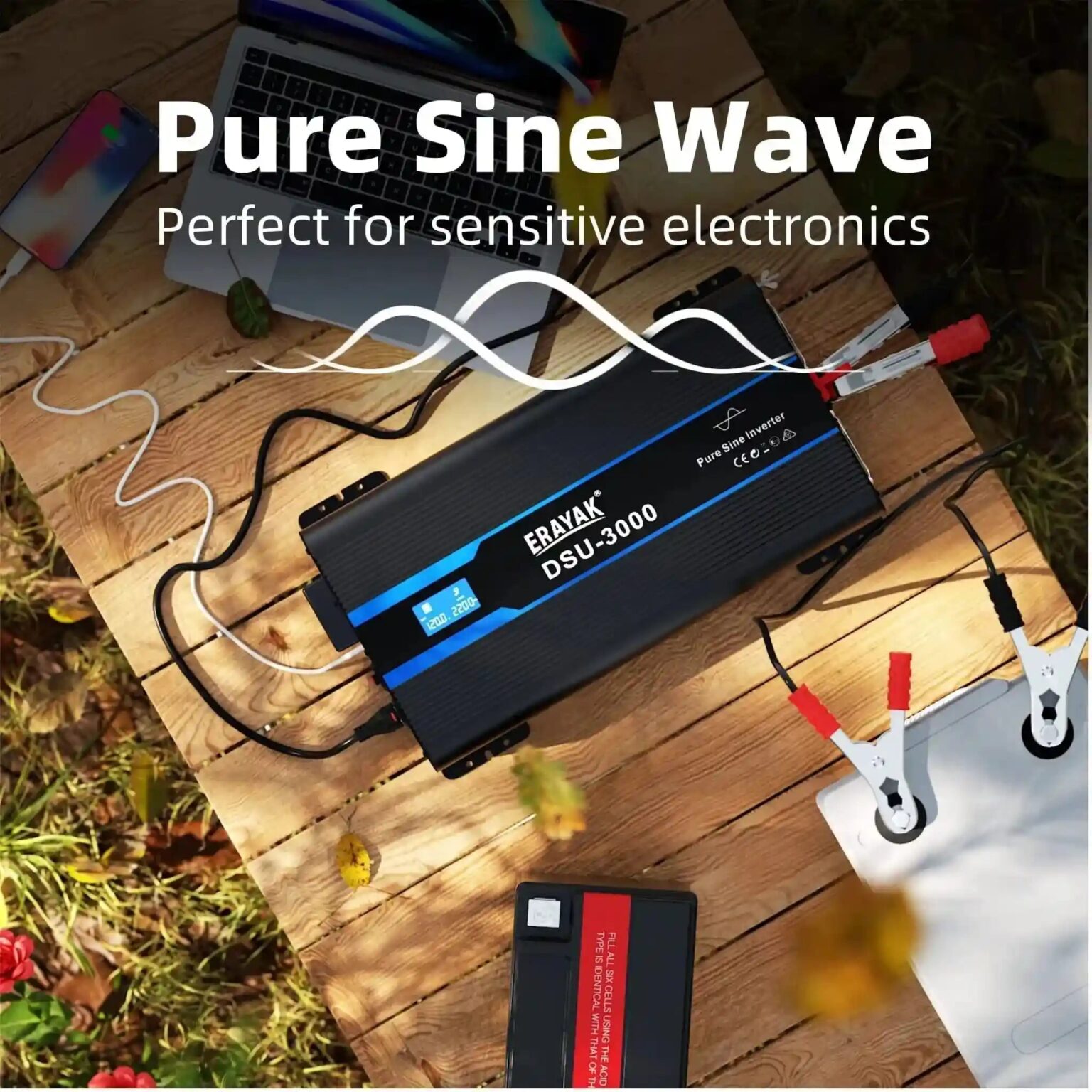 The Erayak 3000W inverter converts 12V DC battery power into clean 110V–120V AC electricity, providing 3000W continuous and 6000W peak output. Its pure sine wave output ensures safe operation of sensitive electronics such as laptops, CPAP machines, and TVs.