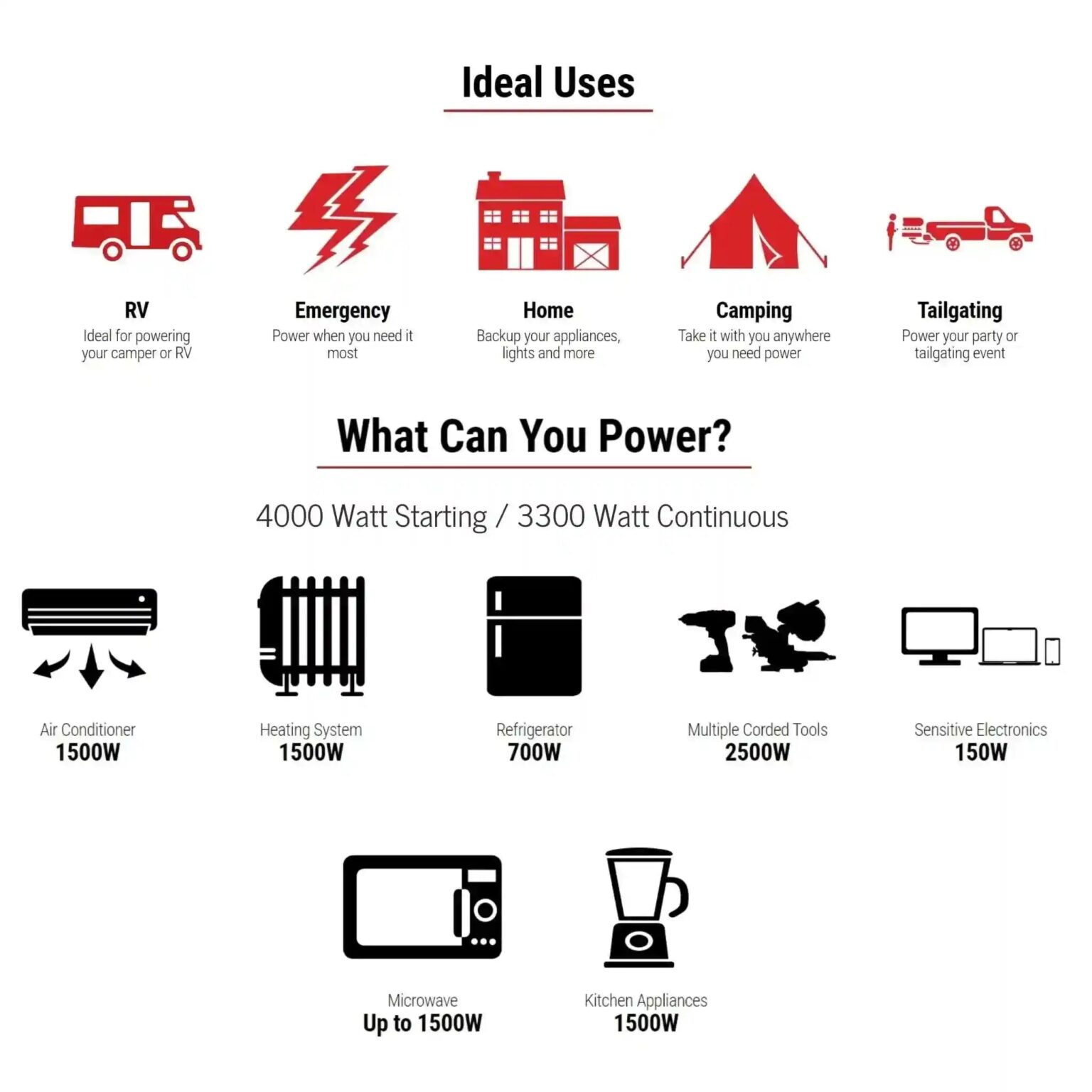 The Erayak SUPER QUIET 4000 Max Starting Watt, 3300 Max Running Watt Inverter Generator uses pure sine wave inverter technology to produce clean power ideal for sensitive electronics such as TVs and laptops. Designed for efficiency, this inverter generator is built with Electronic Speed Control Mode (ESC Mode) to optimize engine performance, maximize runtime, and lower fuel consumption. The lightweight design is ideal for camping, boating, and tailgating. And at only 58 dB(A), this inverter generator runs more quietly than a normal conversation.